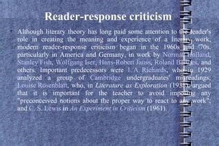 Hans robert jauss reader response criticism meaning example Reading a text in response criticism means that it isn't seen as an object with a single "correct" meaning. Instead, it is seen as a process that happens inside the reader's head. In this way, .